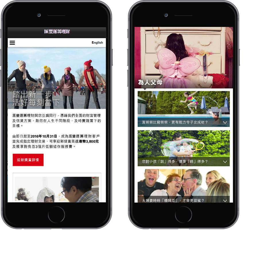 HSBC Advance is supporting clients in different life stages by providing comprehensive wealth management solutions. We made the site that work with digital banners to address your different financial questions in four life stages.